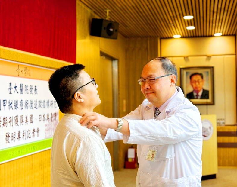 NTUH Department of Internal Medicine deputy director Wang Chih-yuan (王治元), who led the research team, said thyroid cancer is among the 10 most common cancers in Taiwan and the most common in the endocrine system, with about 5,000 new cases diagnosed each year.