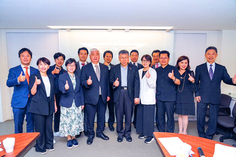 Ko, along with TPP legislators Vivian Huang (黃珊珊) and Wu Chun-cheng (吳春城), TPP International Affairs Advisor Hsieh Ming-chu (謝明珠) and Commissioner of the Taipei Mayor’s Office for External Affairs Tom Chou (周台竹), met with Japan’s “cross-party lawmakers’ group to promote human rights diplomacy” and discussed issues such as foreign and military policies, Taiwan’s sub-replacement fertility rate, Huang’s visit to the US last month and Wu’s initiative to include the “strong generation” in the workforce, the TPP said in a press release yesterday.