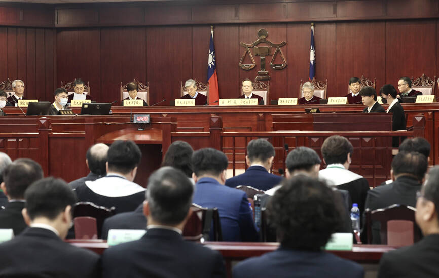 The case is being presided over by 15 justices, who were all appointed by former president Tsai Ing-wen (蔡英文) of the DPP.