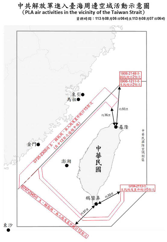From July 26 to Aug. 11, a total of 304 warplanes and drones flew near Taiwan, averaging 12.3 flights per day, while 209 aircraft crossed the median line of the Taiwan Strait, with some flying as close as 37 nautical miles (68.5km) from Oluanpi (鵝鑾鼻), Taiwan’s southernmost tip, MAC data showed.