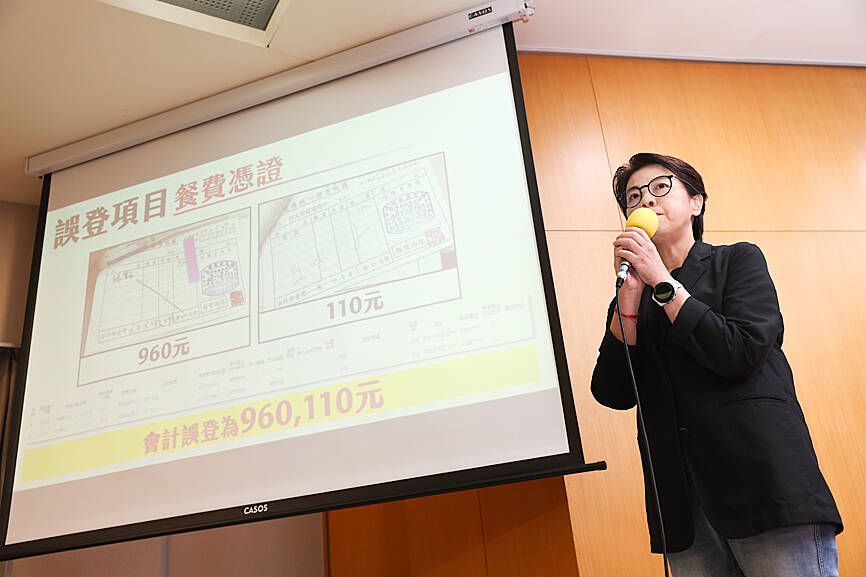 They have found two incorrectly logged records, including two expenditure records of NT$960 (US$29.97) and NT$110 which were incorrectly logged by the accountant as NT$960,110, she said, adding that another is a NT$56,000 payment to buy honey, which was incorrectly logged as NT$5,600.