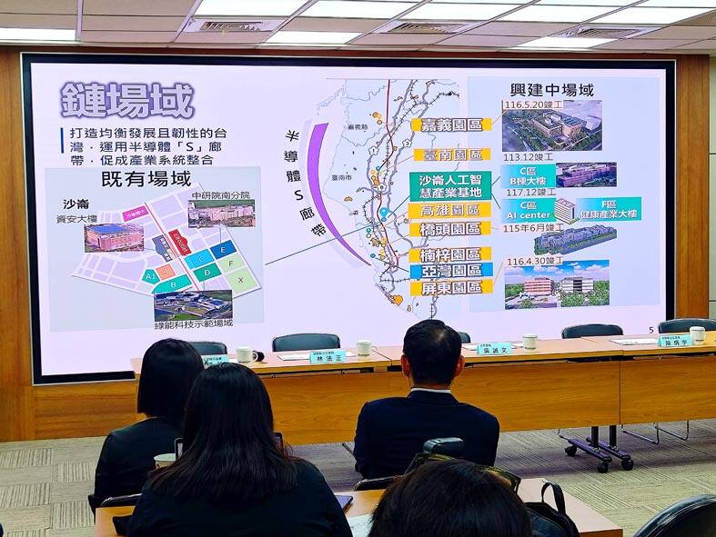 NSTC Vice Minister Su Chen-kang (蘇振綱) said the project would focus on Tainan’s Shalun Township (沙崙), which already houses the Executive Yuan’s Cyber Security & Smart Technology Research & Development Building — a test site for innovative technology — Academia Sinica’s southern branch and the Green Energy Technology Demonstration Site.