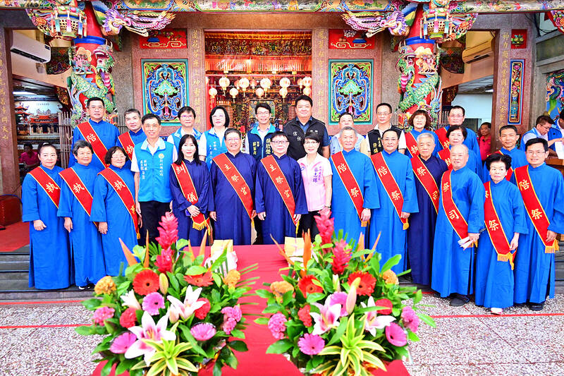 Hsinchu County Govermment officials pose for a photograph during a ceremony marking the upcoming 2,574th anniversary of Confucius’ birth held at Fonglien Temple yesterday. Taiwanese celebrate Sept. 28 as Teachers’ Day in honor of Confucius’ birthday.