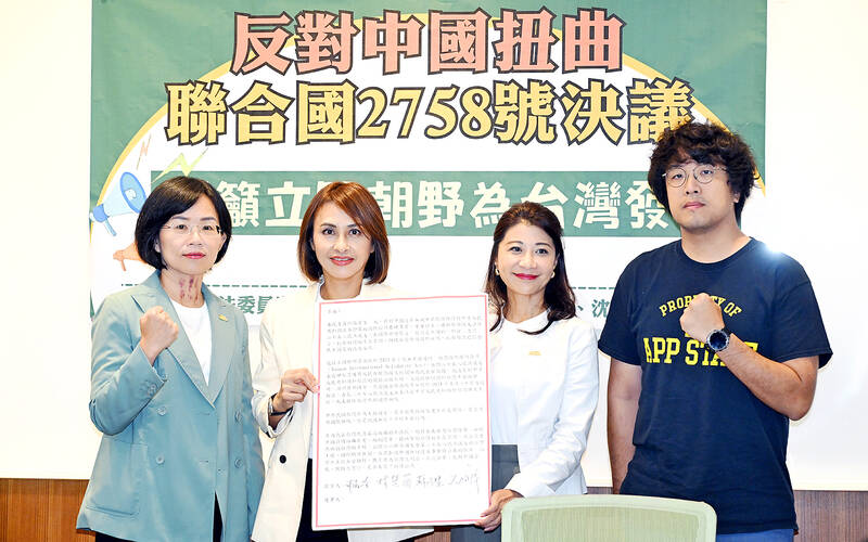 DPP legislators Chiu Yi-ying (邱議瑩), Michelle Lin (林楚茵), Su Chiao-hui (蘇巧慧) and Puma Shen (沈伯洋) said that the news conference was held to “oppose China’s distortion of UN Resolution 2758 and call on all political parties to speak up for Taiwan.”