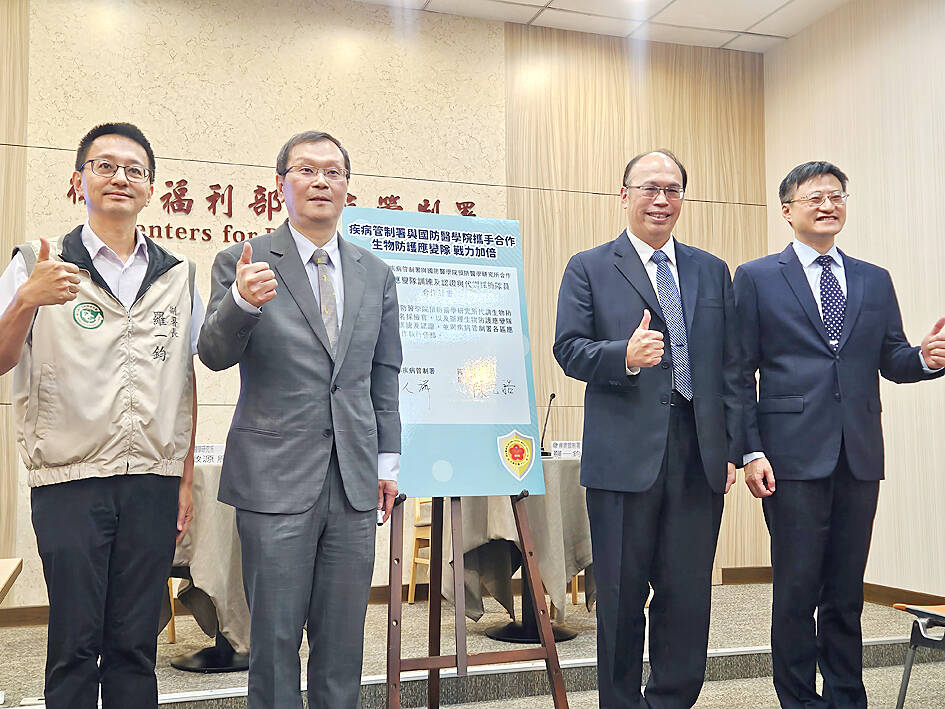 The CDC and the National Defense Medical Center have conducted joint training sessions focused on protective gear, emergency procedures and new technology training, Ministry of National Defense Medical Affairs Bureau official Chen Yuan-hao (陳元皓) said.