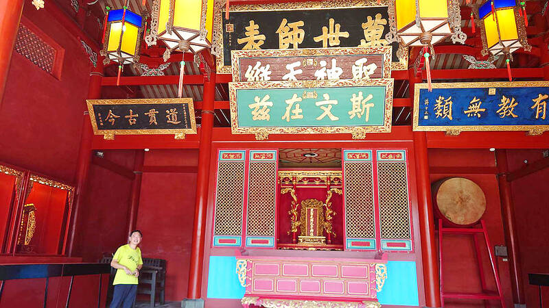 The temple’s Da Cheng Hall houses all the plaques given to the temple since Emperor Kangxi (康熙) of the Qing Dynasty from 1683, except for the plaque of Emperor Aisin Gioro Puyi, or Emperor Xuan Tong (宣統), Tainan Confucius Temple Culture Foundation director Shih Mu-min (石牧民) said.