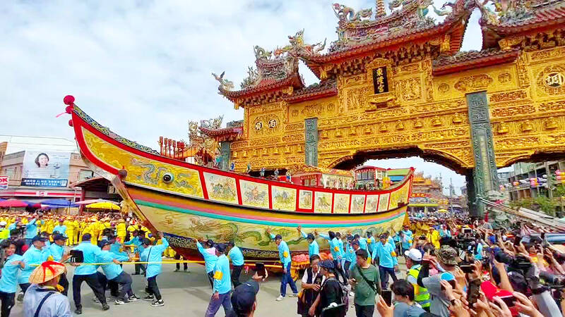 People carry the King Boat during a ceremony hosted by Donglong Temple in Pingtung County’s Donggang Township yesterday. The event is held once every three years with the aim to prevent the spread of plagues. The ceremony culminates today with the burning of the purpose-built King Boat on a beach in Donggang Township, signifying the deity being sent off.