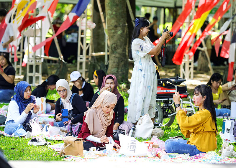 Migrant workers take part in a “Migrant Workers Picnic Day in Taipei” event organized by the Taipei City Government at Daan Forest Park yesterday.