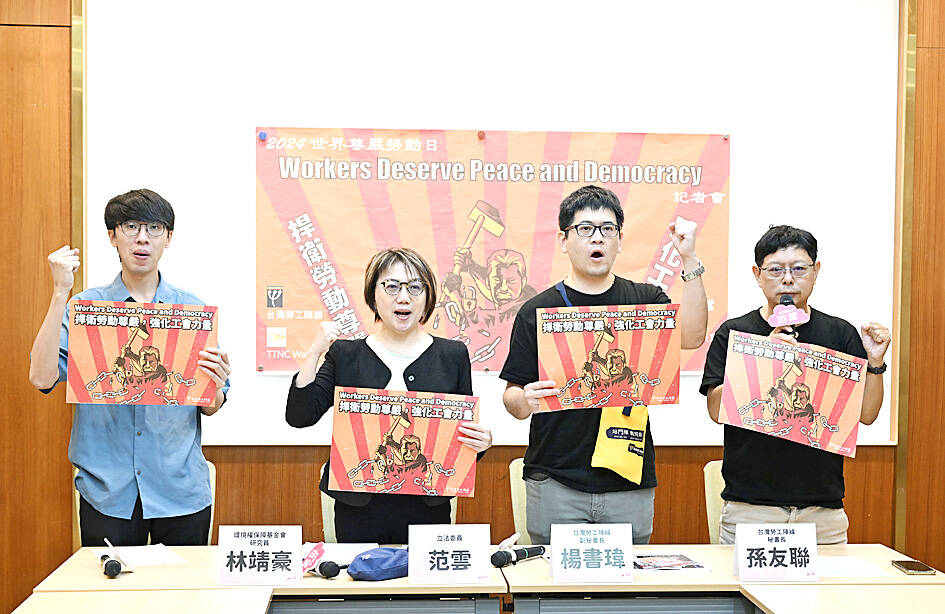 The group issued the remarks at a news conference with Democratic Progressive Party Legislator Fan Yun (范雲) to mark World Day for Decent Work, the theme of which this year is “Workers Deserve Peace and Democracy.”