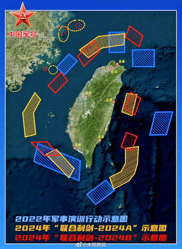 “All the drill zones they announced are more closely approaching Taiwan proper, and all include the 24 nautical mile zone,” said Ma Chen-kun (馬振坤), director of the Graduate Institute of China Military Affairs Studies at National Defense University.