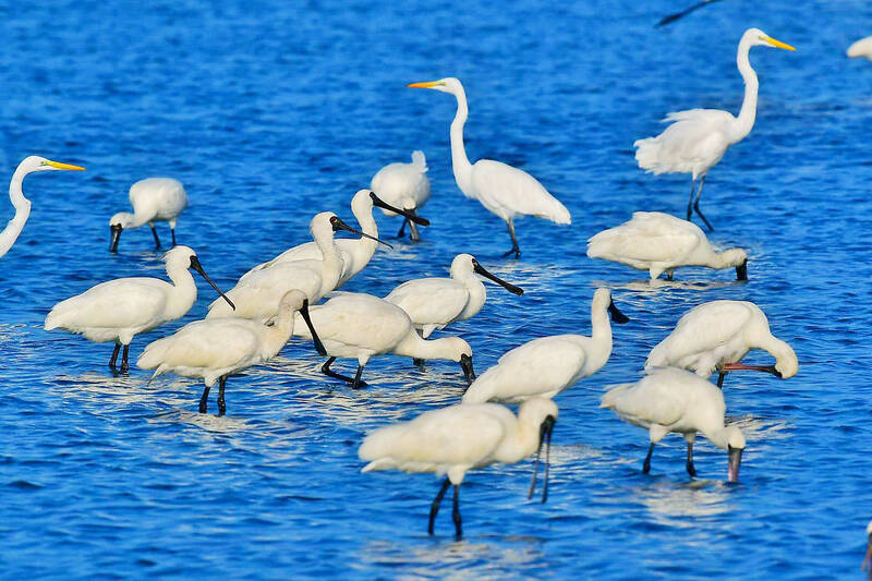 Black-faced spoonbills gather in Tainan yesterday. Nearly 300 of the endangered bird species have migrated to the city so far for the winter, the Wildlife Conservation Institute of Tainan said, as the city government opened the black-faced spoonbill conservation season in the city’s Cigu District yesterday.