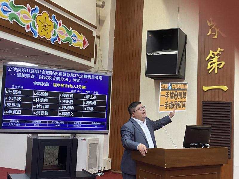 DPP Legislator Kuo Kuo-wen (郭國文) said that reviewing the amendments to the Act Governing the Allocation of Government Revenues and Expenditures (財政收支劃分法) before approving a national budget would damage institutional integrity and paralyze the central government.