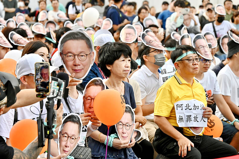 Peggy Chen, wife of Taiwan People’s Party (TPP) Chairman Ko Wen-je, front row, second right, joins supporters at an event hosted by the party in Taipei yesterday. TPP supporters have accused the administration of the Democratic Progressive Party of unfair treatment of Ko, who has been detained since Sept. 5 over alleged corruption dating to his time as Taipei mayor.