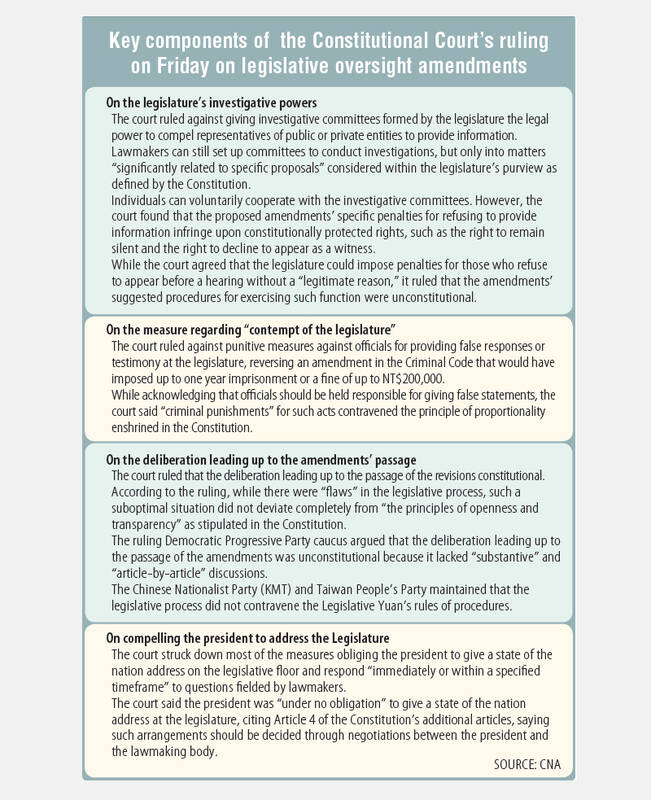 Lawmakers yesterday continued to argue over legislative oversight reforms pushed through in May after the Constitutional Court on Friday ruled that most of the amendments expanding the legislature’s power to oversee the executive branch of government are unconstitutional, including those that would have given legislators broader investigative powers.