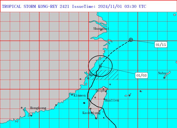 The land warning issued by the CWA on Tuesday remains in effect in Lienchiang and the sea warning, issued on Wednesday, is still in place in the seas off northern Taiwan.