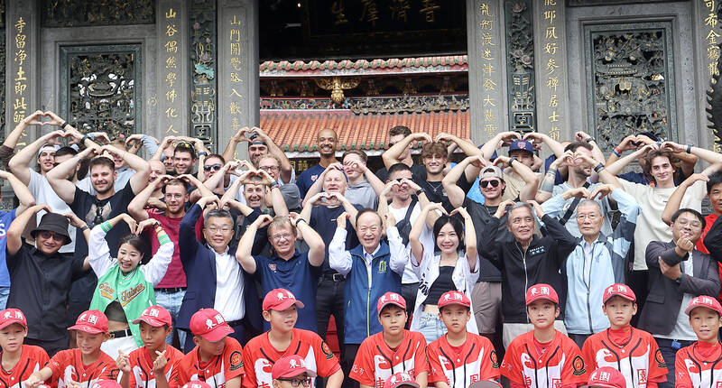 Chinese Professional Baseball League president Tsai Chi-chang, second row, seventh right, and Longshan Temple vice chairman Huang Shu-wei, second row, fifth right, pose for a photograph along with the Czech Republic national baseball team and Dong Yuan Elementary School’s youth baseball team in Taipei yesterday. The Czech team visited Longshan Temple in Taipei’s Wanhua District yesterday after completing their exchange matches with Taiwan’s baseball team last weekend.