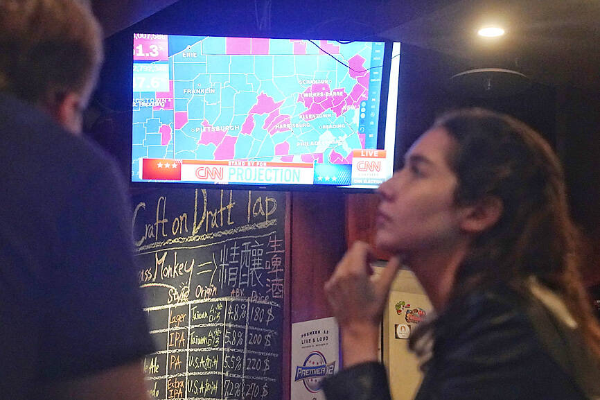As votes determining the next US president were being counted, people gathered yesterday morning at a bar in downtown Taipei to follow live updates of a race that was clearly moving in former US president Donald Trump’s favor.