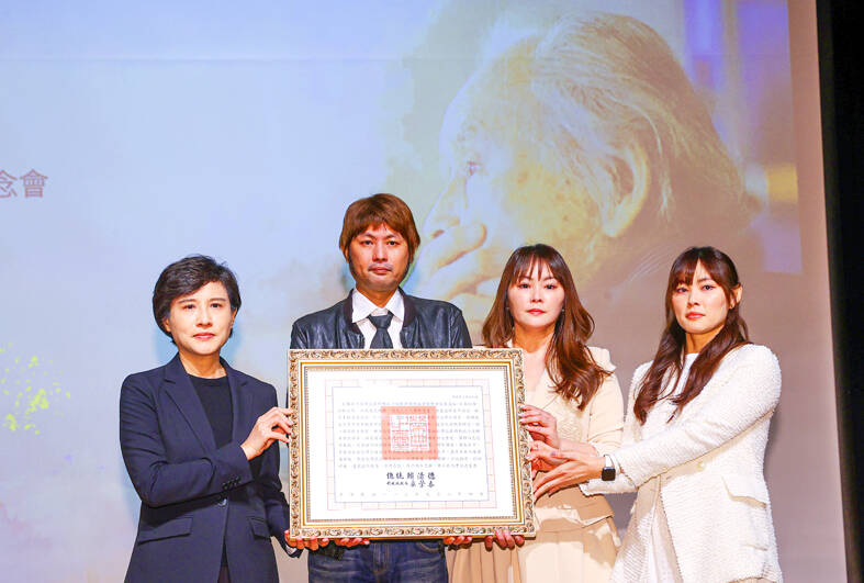 At a memorial in New Taipei City, Tsai’s three children accepted the citation from Vice Premier Cheng Li-chiun (鄭麗君).