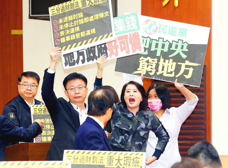 The main opposition Chinese Nationalist Party (KMT), together with the smaller Taiwan People’s Party (TPT), has a majority in the Legislature, and they are seeking to pass 22 amendments to the Act Governing the Allocation of Government Revenues and Expenditures (財政收支劃分法) opposed by the ruling Democratic Progressive Party (DPP).
