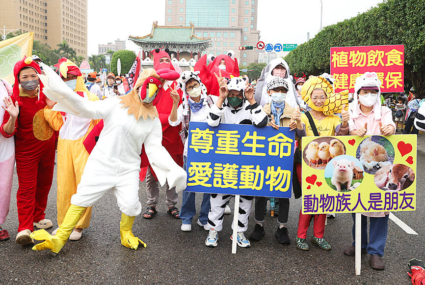 “We want more people to be more aware of a vegan diet,” said Chang You-chuan (張祐銓), director-general of the Sustainable Healthy Diets Research Institute, the organizer of yesterday’s parade.