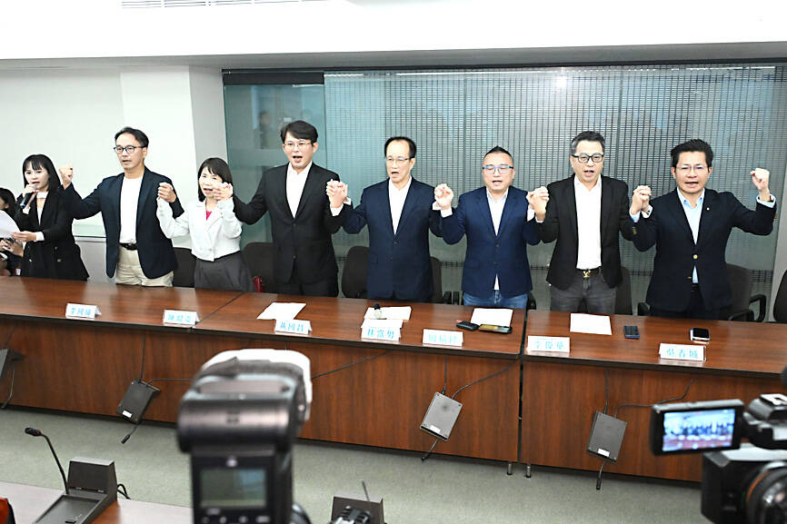 Committee members Lin Fu-nan (林富男), Huang Kuo-chang (黃國昌), Wu Chun-cheng (吳春城), Chen Gau-tzu (陳昭姿), Lee Kuo-chang (李國璋) and Hsu Jui-hung (許瑞宏), as well as committee chairman Lee Wei-hua (李偉華) and TPP Secretary-General Vincent Chou (周榆修) were in attendance.
