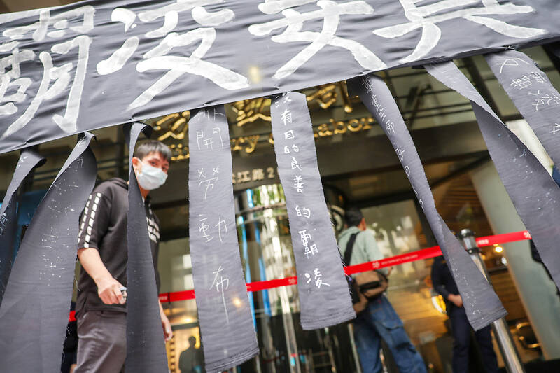Protesters gathered outside the ministry in Taipei yesterday morning holding a black cloth saying: “Anti-bullying, we want truth.”