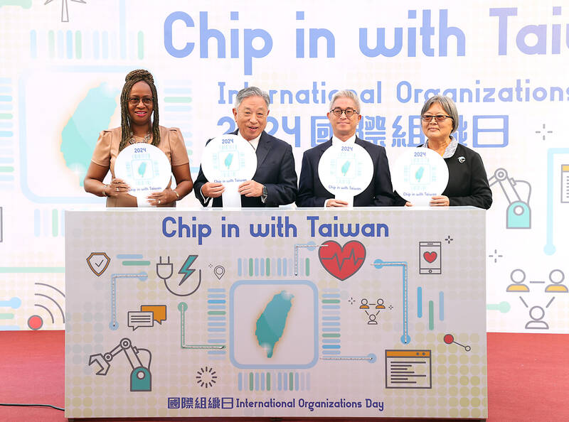 From left, St Vincent and the Grenadines Ambassador to Taiwan Andrea Clare Bowman, Deputy Minister of Foreign Affairs Tien Chung-kwang, National Security Council Deputy Secretary-General Hsu Szu-chien and Food and Fertilizer Technology Center for the Asian and Pacific Region Director Chang Su-san pose for a photo at the Chip in With Taiwan International Organization Day opening ceremony yesterday. The event, held at the Taipei Guest House, showcased Taiwan’s role in response to various international challenges.