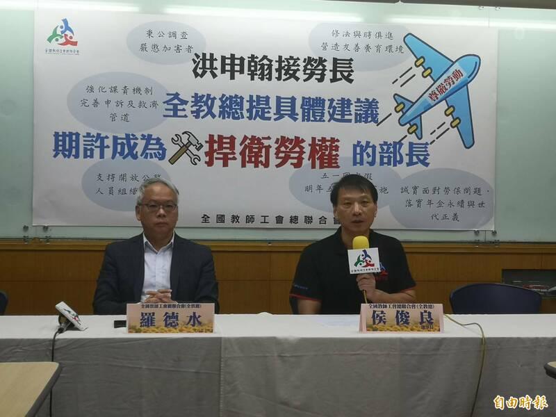 The National Federation of Teachers’ Unions presented six recommendations to new Minister of Labor Hung Sun-han (洪申翰) during a news conference today.
