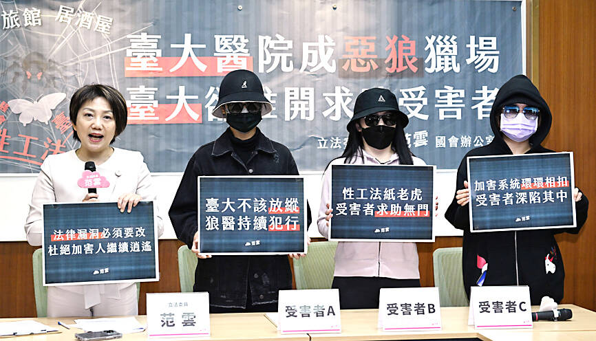 After neither National Taiwan University nor NTUH conducted an internal probe, the women went to Democratic Progressive Party Legislator Fan Yun (范雲), who convened a news conference in March last year to publicize the allegations.