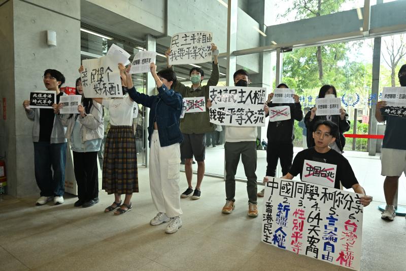 "We support Chinese students coming to Taiwan for exchanges, but it should be based on equality and openness," said a third-year NTU student, surnamed Chang (張), who attended the protest.