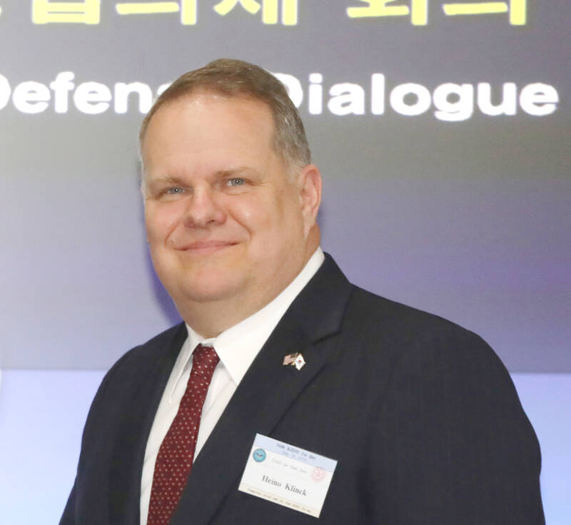Reporters asked former deputy assistant secretary of defense for East Asia Heino Klinck about China using US stopovers by President William Lai (賴清德) to justify military exercises near Taiwan.