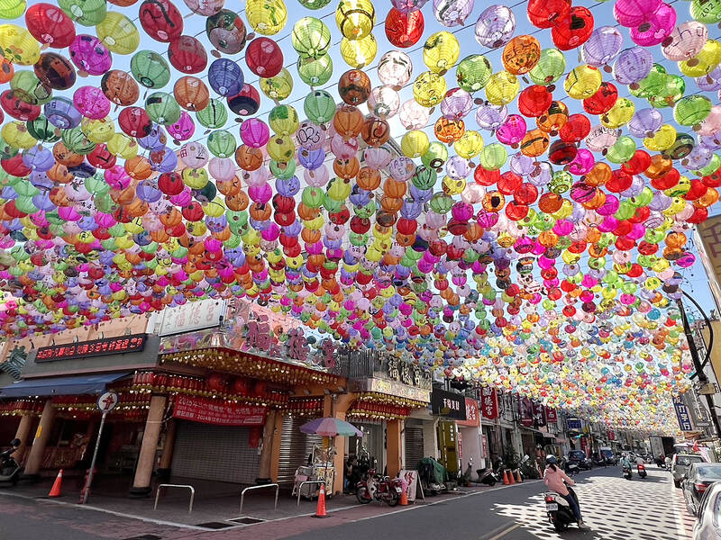 Colorful lanterns hanging above Taiping Old Street in Yunlin County ‘s Douliou City are pictured yesterday. The city’s mayor said the lanterns are to be lit up from the evening of Dec. 21 in celebration of the New Year.