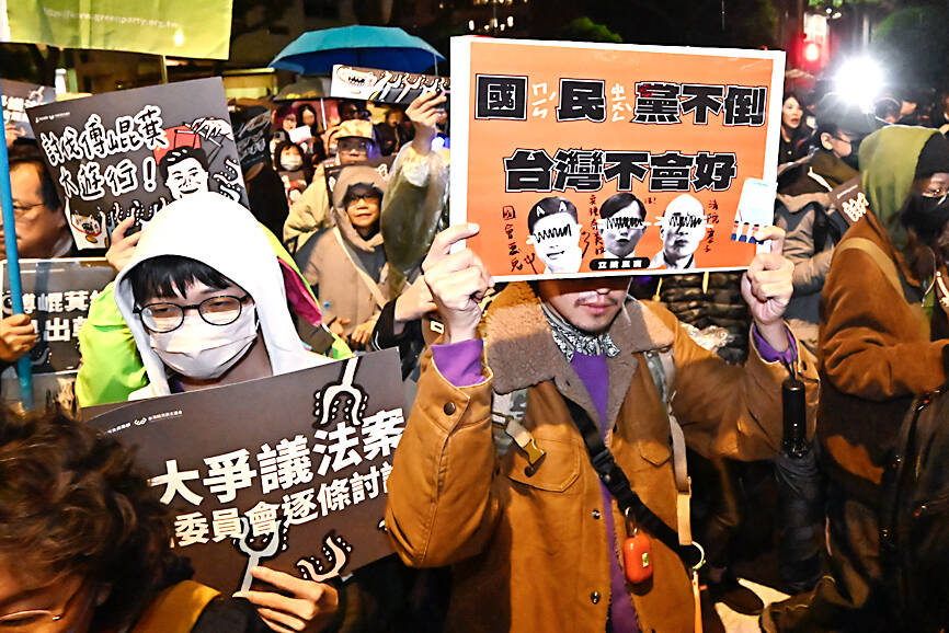 Civil society groups yesterday protested outside the Legislative Yuan, decrying Chinese Nationalist Party (KMT) efforts to pass three major bills that they said would seriously harm Taiwan’s democracy, and called to oust KMT caucus whip Fu Kun-chi (傅?萁).