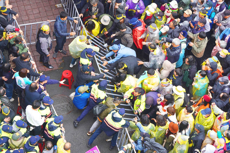 Protesters removed metal barricades in clashes with police at about 11:30am as they tried to access the Legislative Yuan from a side entrance on Jinan Road, a move reminiscent of the Sunflower movement 10 years ago.
