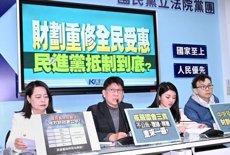 The KMT news conference — titled "The funding allocation overhaul will benefit everyone: Will the DPP resist endlessly?" — took place on the same day the DPP caucus held its own news conference titled "The sinister funding allocation amendments will harm everyone."