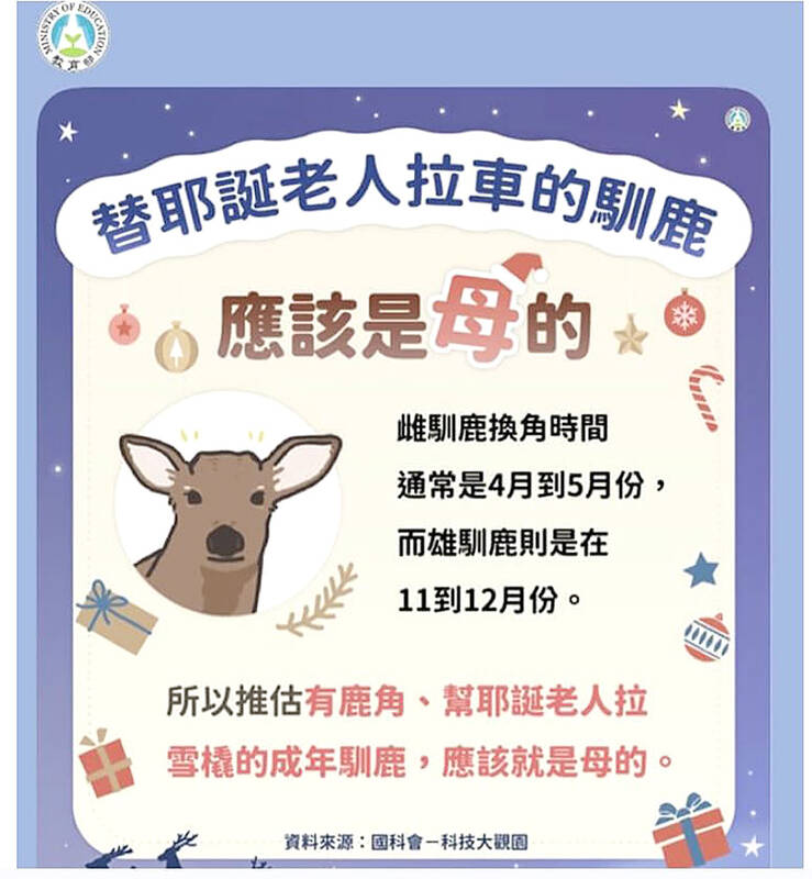 The Ministry of Education often sends out quiz questions on its official Line account, and to celebrate Christmas Day yesterday, the question was: “Are the reindeer that pull Santa’s sleigh male or female?” — but more than 60 percent of people answered incorrectly.