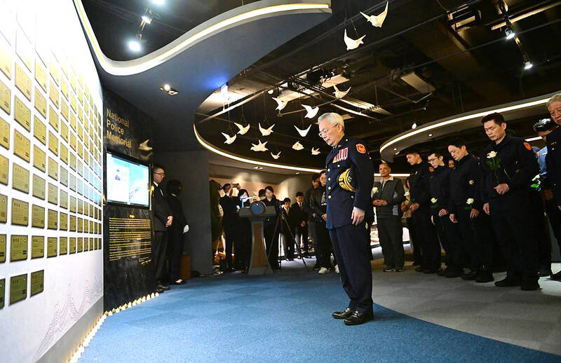 National Police Agency Director-General Chang Jun-hsin, front, leads police representatives and surviving kin to pay their respects to officers who have died in the line of duty at the agency’s Museum of Police History in Taipei yesterday.