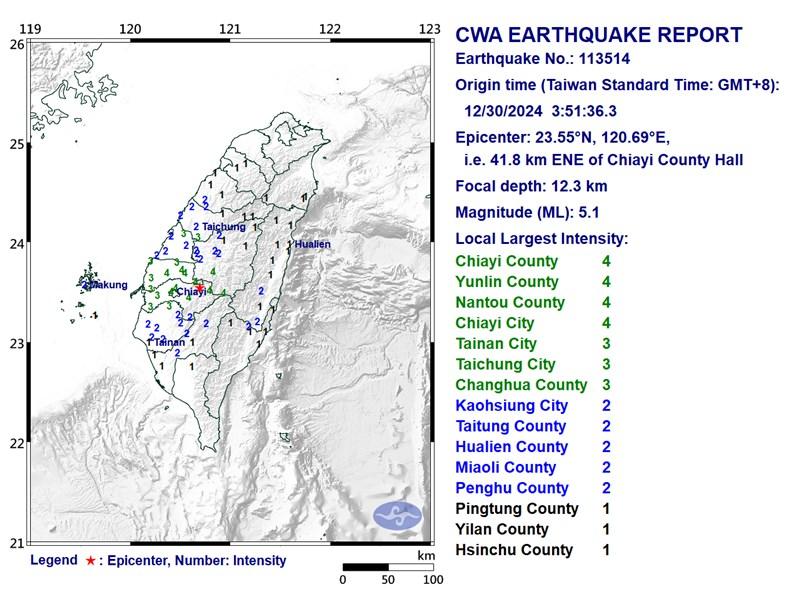 According to the CWA, the earthquake's intensity was highest in Chiayi County, Chiayi City, and neighboring Yunlin and Nantou counties, where it measured a 4 on Taiwan's 7-tier scale.
