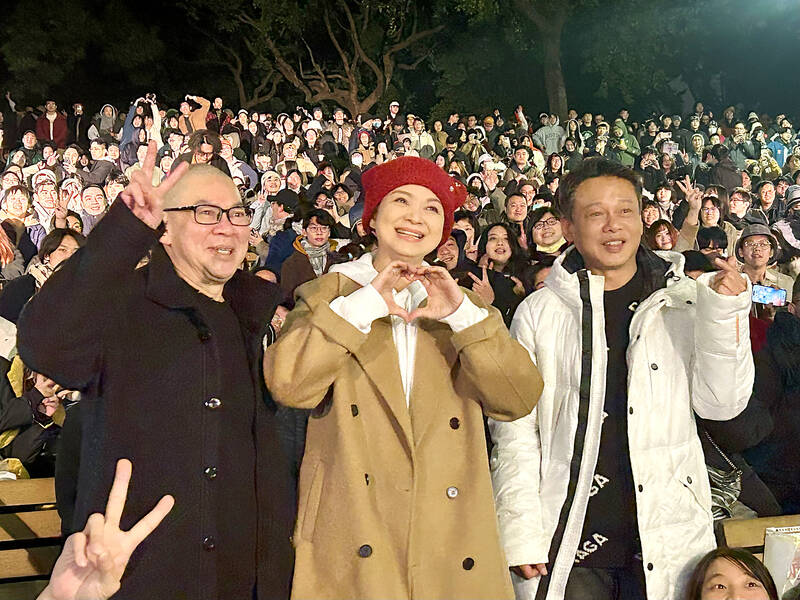 The New Year’s Eve special screening of Taiwan-based Malaysian director Tsai Ming-liang’s (蔡明亮) award-winning film at Daan Forest Park’s outdoor stage commenced at 9:45pm and was followed by a countdown to midnight with Tsai, Yang Kuei-mei (楊貴媚) and Lee Kang-sheng (李康生) — the lead actress and actor in the movie.