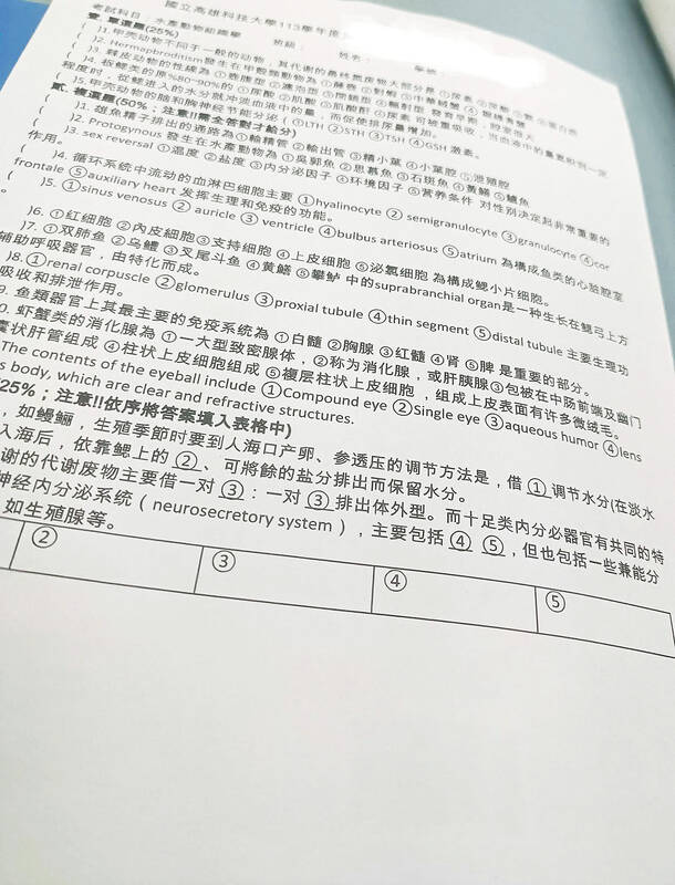 Regarding the textbook, there is no traditional Chinese version of it, so the instructor used versions written in simplified Chinese and English, it said, adding that the English-language material was not used in the exam.