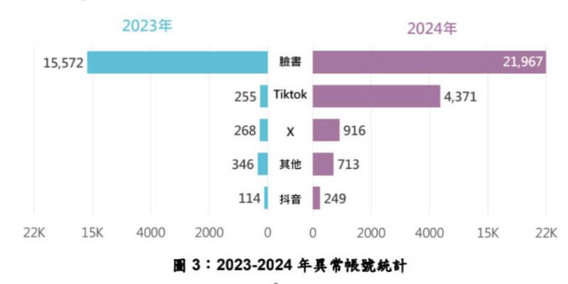 Facebook had 21,967 of these accounts, but TikTok, X and China’s Douyin (抖音) also saw major increases, the NSB’s data showed.
