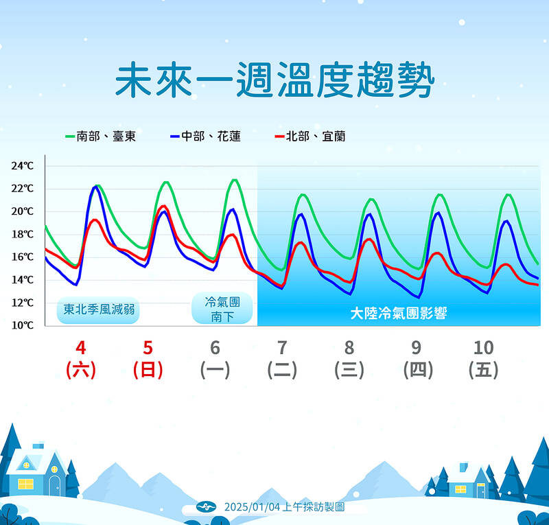 While the weather would still be influenced by the cold air mass on Saturday next week, with chilly weather predicted for northern Taiwan throughout the day, in the early mornings and at night in other parts of the country, the strength of the cold air is unclear, it said.
