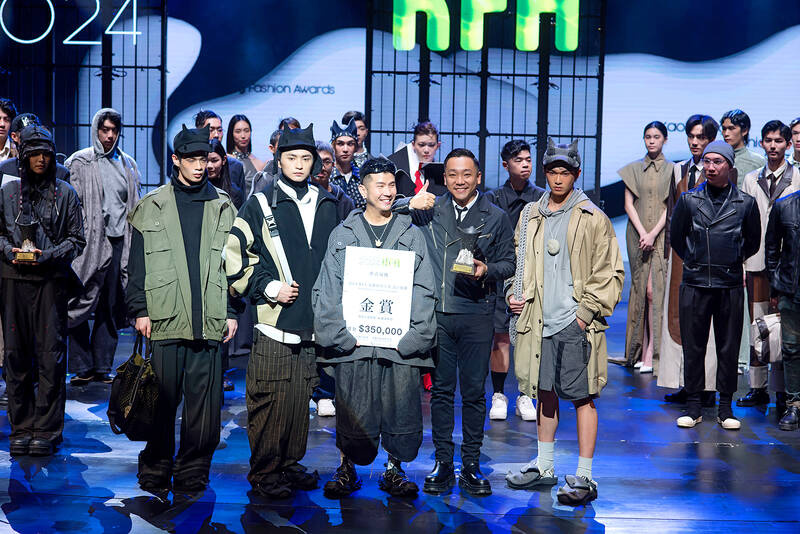 Taiwanese designer Fusio Fusio, front row, center, with the gold prize certificate along with models wearing outfits from his Snail Man series, and Kaohsiung City Government Youth Bureau Director Chang Yi-li, front, second right, pose for a photograph at the Kaohsiung Fashion Awards at the National Kaohsiung Center for the Arts yesterday.