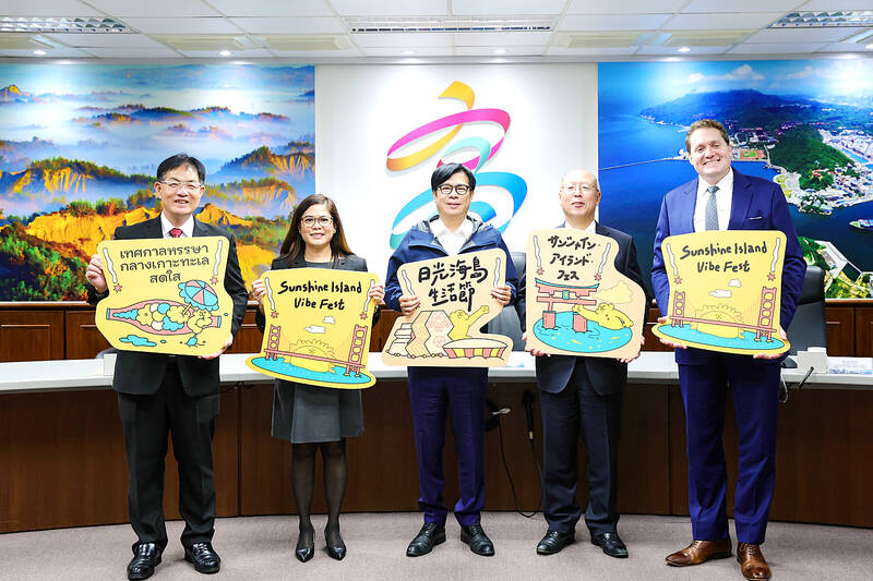 From left, Thailand Trade and Economic Office Labor Division in Kaohsiung Director Nutchyawach Sanguanchaiyakrit, Manila Economic and Cultural Office Kaohsiung Extension Office Representative Karina Bercasio Perida-Trayvilla, Kaohsiung Mayor Chen Chi-mai, Japan-Taiwan Exchange Association Kaohsiung Office Director Masafumi Oku and American Institute in Taiwan Kaohsiung Branch Office Chief Neil Gibson pose at an event in Kaohsiung yesterday to promote next month’s Sunshine Island Vibe Fest in the city.