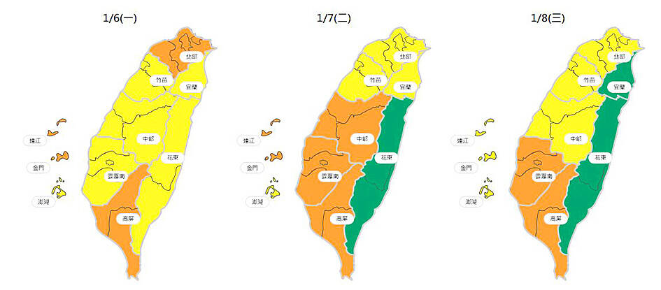 The ministry yesterday said that air quality across Taiwan is expected to range from “moderate to orange” warning levels from today to Thursday.