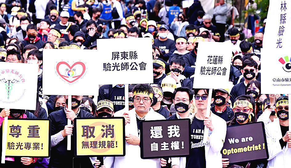 People working in the nation’s vision care and prescription eyeglass sector held a protest outside the Legislative Yuan in Taipei yesterday, calling for the use of the term “optometrist” instead of “optician.”