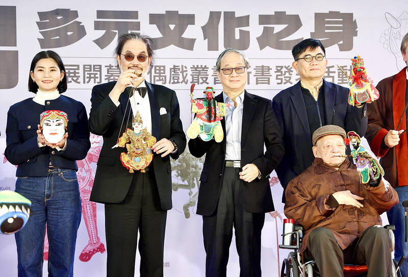 Minister of Culture Li Yuan, third left, National Taiwan Museum director Chen Teng-chin, back row, second right, Taiyuan Culture Group chairman Lin Jing-fu, second left, and other event guests pose for a photograph at the opening ceremony of a special exhibition on puppets. The exhibition is to run until Aug. 31 at the museum.
