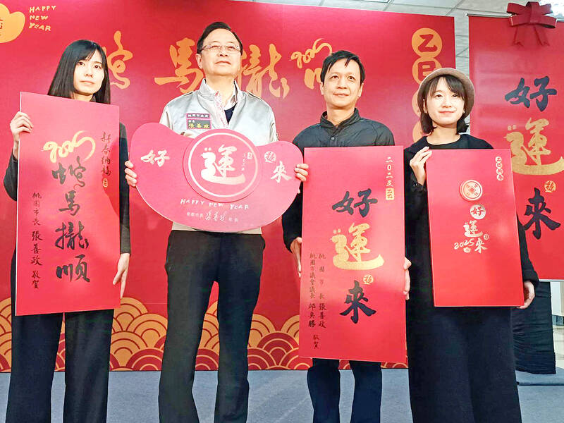 From left, caligrapher Wang Yu-cyuan, Taoyuan Mayor Simon Chang, caligrapher Hsu Ching-lung and designer Lin Tai-jung display Lunar New Year couplets and decorations that the Taiyuan City Government plans to distribute in the buildup to the Lunar New Year holiday, which begins on Jan. 25.
