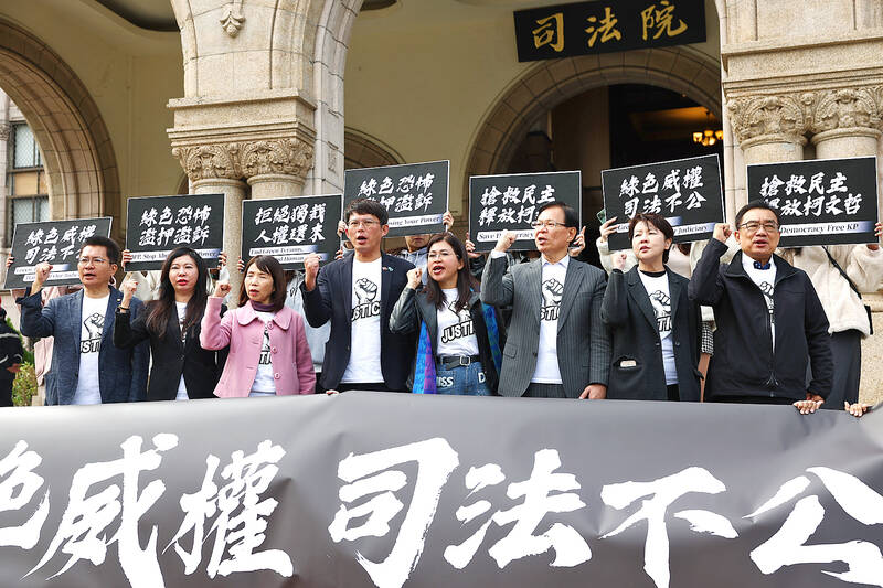 Taiwan People’s Party (TPP) Acting Chairman Huang Kuo-chang, fourth left, leads TPP lawmakers in a news conference in front of the Judicial Yuan yesterday calling for the public to join them in a demonstration on Saturday, Judicial Day, to oppose “Green Authoritarianism and Injustice” and defend Taiwan’s democracy, rule of law and human rights.