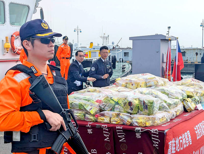 A Coast Guard Administration agent stands guard over packets of confiscated amphetamine at a press conference in Kaohsiung yesterday. Nearly 500 packets of the drug, worth over NT$1 billion (US$30.3 million), were seized from a Sierra Lione-flagged cargo ship on Aug. 10 last year with assistance from police, prosecutors said.